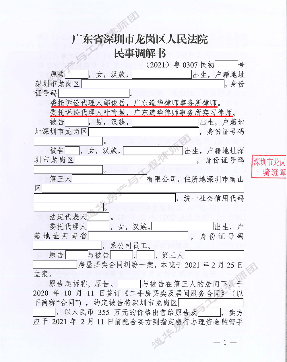 导语:对于深圳这个成熟的房产买卖交易市场而言,买房就是投资,面对好的地段越来越少、房企接连暴雷的情况,越来越多的人选择了二手房买卖交易。肖女士便是其中之一,2020年十月,肖女士及其丈夫在中介的介绍下购买了鑫某位于龙岗区的一处房屋,并按约定交付了定金并办理了公证。在合同履行过程中,该片区的房屋价格突然大幅度上涨,卖家一看形势觉得自己卖亏本了,便想解除该购房合同重新高价卖出。作为购房者的肖女士曾多次找到中介机构与鑫某协商继续履行合同,但双方依旧僵持不下,鑫某拉黑肖女士,拒绝联系。面对此种形势,肖女士亦在多番对比下,委托广东道华律师事务所寻求帮助。通过道华房产律师通过谈判、诉讼同步推进,最终在两个月内在龙岗区人民法院达成调解,成功解决双方纠纷。